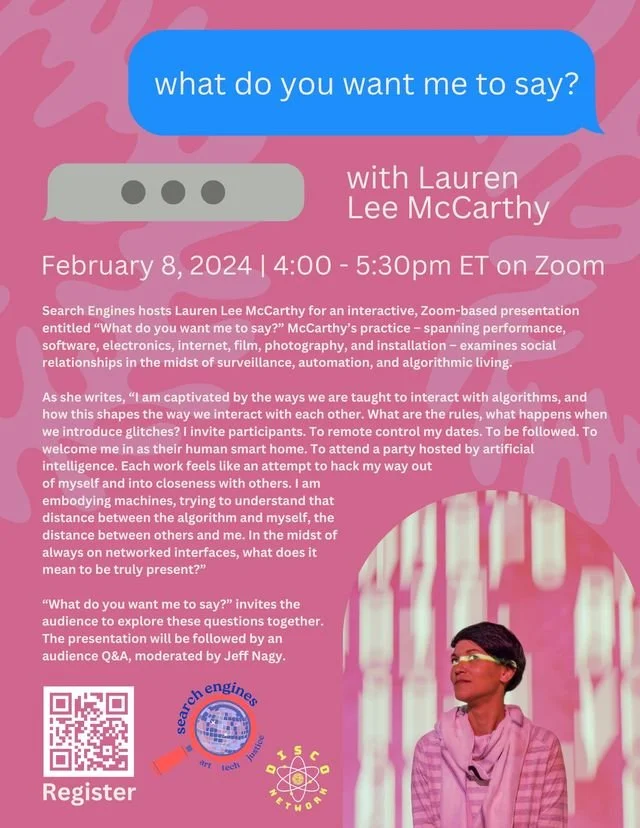Search Engines hosts Lauren Lee McCarthy for an interactive, Zoom-based presentation entitled, "What do you want me to say?" McCarthy's practice-spanning performance, software, electronics, internet, film, photography, and installation - examines social relationships in the midst of surveillance, automation, and algorithmic living.