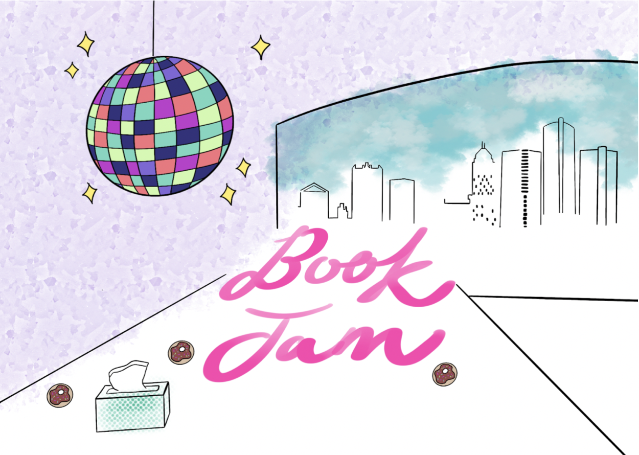 Image description: ‘Book Jam’ in pink cursive handwriting in the middle of long white conference table. The conference table meets the Detroit skyline where there’s a huge window. On the table is a aqua Kleenex box and chocolate sprinkle donuts. Hanging above is a multicolored disco ball.
