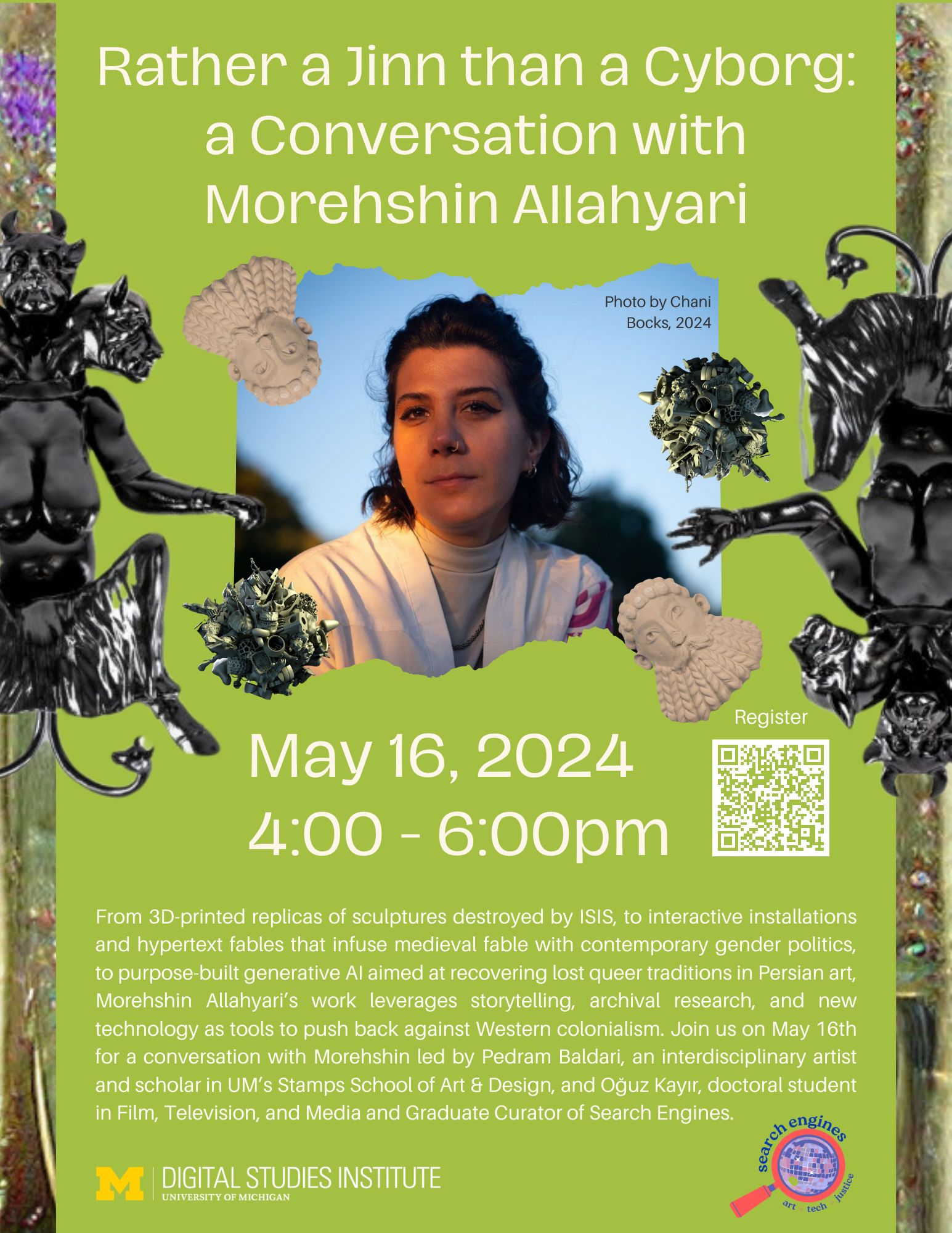 From 3D-printed replicas of sculptures destroyed by ISIS, to interactive installations and hypertext fables that infuse medieval fable with contemporary gender politics, to purpose-built generative AI aimed at recovering lost queer traditions in Persian art, Morehshin Allahyari’s work leverages storytelling, archival research, and new technology as tools to push back against Western colonialism. Join us on May 16th for a conversation with Morehshin led by Pedram Baldari, an interdisciplinary artist and scholar in UM’s Stamps School of Art & Design, and Oğuz Kayır, doctoral student in Film, Television, and Media and Graduate Curator of Search Engines.
